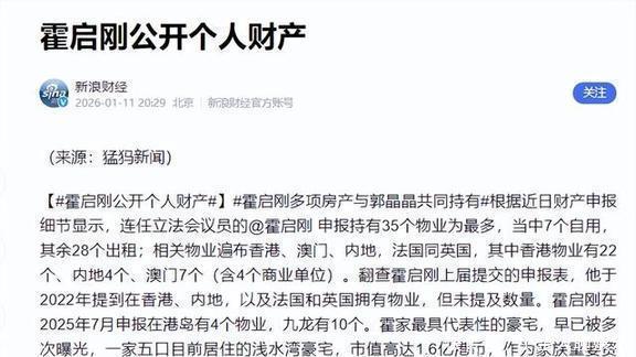 再想到最近他作为香港立法会议员,按照规定第一次全盘公开自己的资产,竟然有35处房产,自己住的有7套,出租的有28套,分布在国内外各地。这招真是大方,足见霍启刚作为霍家新一代的接班人的坦诚和长远的眼光。真是让人不得不佩服郭晶晶眼光真不错,选的老公真棒。