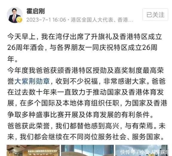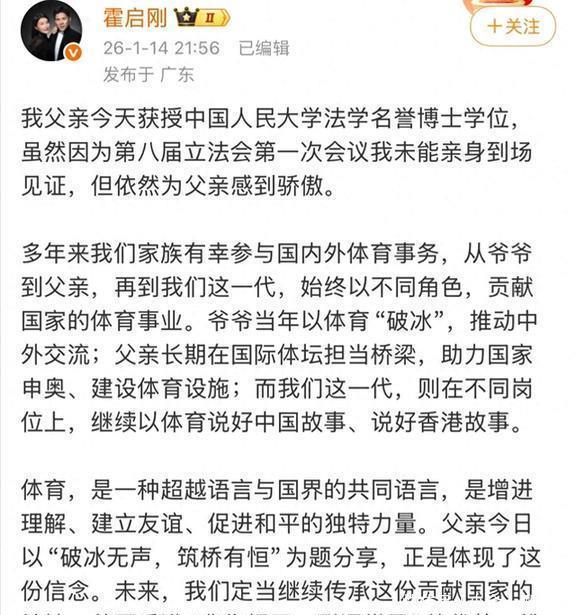 1月14日,霍启刚在社交媒体上发文庆祝他爸霍震霆拿到了中国人民大学法学名誉博士的学位,他说因为工作没法亲自去现场,不过他对老爸感到非常骄傲。霍启刚在一篇长文章里,回顾了霍家怎样参与国内外体育事务,聊了聊家族在不同岗位上的角色。他感慨体育的独特力量和影响,也对父亲传承的信念表示赞赏,感到自豪的是祖孙三代为国家的体育事业出力,最后还对未来作了个展望和承诺。从字里行间,我看得出,霍启刚现在越来越像个掌控全局的高手了。当然能看出来,他对老爸霍震霆满怀敬意。